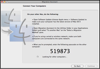 If the Mac you’re setting up is running 10.7 or 10.8, see Using Migration Assistant with Mountain Lion or Lion. It's a bit different from the Snow Leopard and Leopard version covered here. (If you're not sure what version of OSX you're running, click here).