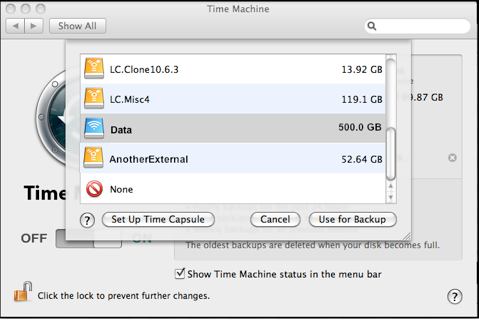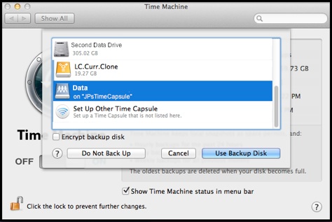 A list of possible destinations will appear. If you've already set up a Time Capsule, it should appear in the list (usually named Data). If not, select the last item to do that.