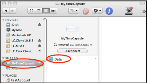 e.A prompt for your name and password will appear. In some cases there won't be a Name field, but if there is, enter your short user name. Also enter the password you set up for the Time Capsule via Airport Utility, then click the Connect button.